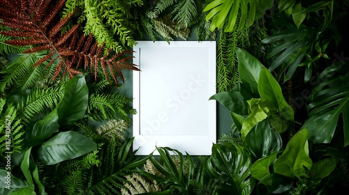 © Asawin, Obraz premium an empty white picture frame surrounded by various green tropical leaves, symbolizing nature and freshness