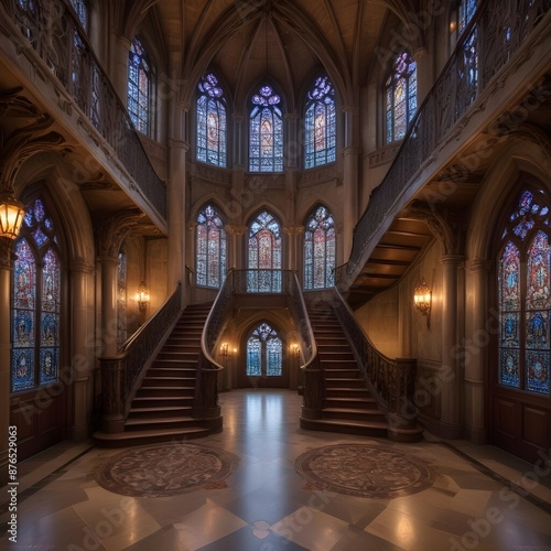 © Aaron, Fototapeta premium An enchanted castle interior with grand staircases and stained glass windows