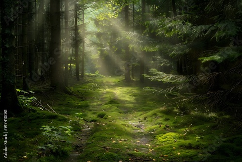 Fototapeta premium An enchanted forest path, soft light rays breaking through dense canopy,...