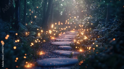 © Rinowz, Naklejka premium An enchanted ink drop shapes into a glowing enchanted path, its stones and foliage illuminated by a soft, magical glow.