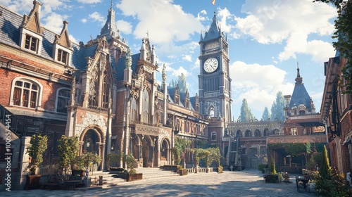 © Kitta Studio, Fototapeta premium An enchanting architectural view featuring historic buildings and a prominent clock tower under a bright blue sky.