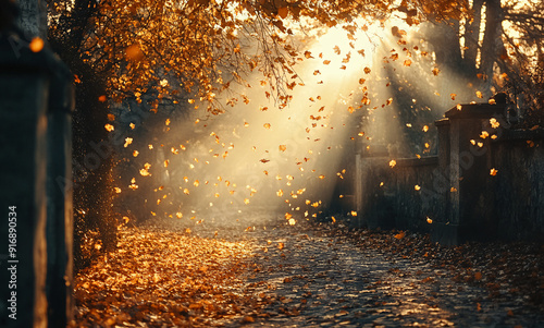 © NE97, Naklejka premium An enchanting autumn scene with a sunlit alley turning through a park filled with golden foliage and tranquil beauty.