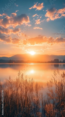 © Shyamal, Fototapeta premium An enchanting panorama of sunrise over the lake's still waters.