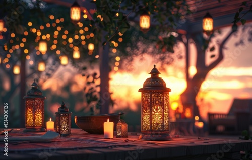 © Muhammad Hammad Zia, Fototapeta premium An enchanting Ramadan evening featuring traditional lanterns, warm candlelight, and a scenic city view, perfect for an Iftar celebration