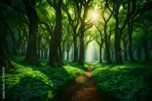 © Fajar, Naklejka premium An enchanting scene featuring a grove of green trees, the high-definition camera showcasing the lush foliage and the interplay of light and shadow in vivid