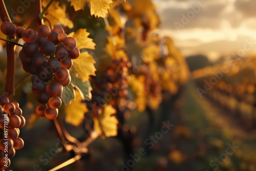 Fototapeta premium An enchanting scene of a vineyard at sunset with vines glowing in the warm light of autumn