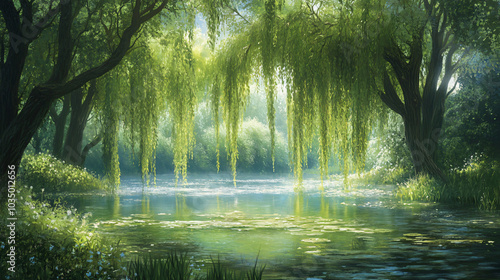 Fototapeta premium An enchanting scene of willow trees draping over a serene pond, providing a...