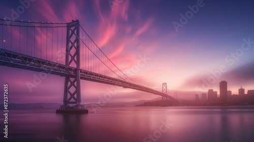 © Eleanor Richards, Obraz premium An enchanting view of a long bridge at twilight, stretching across calm waters, with the sky painted in hues of pink and purple, representing the peaceful transition between day and night.