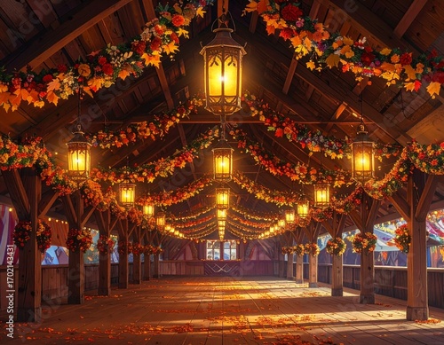 Obraz premium An enchanting wooden covered bridge illuminated by glowing lanterns and adorned with festive autumn garlands