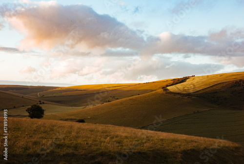 Obraz premium An ending sunset creates a colourful sky and textured valley in South Downs,...