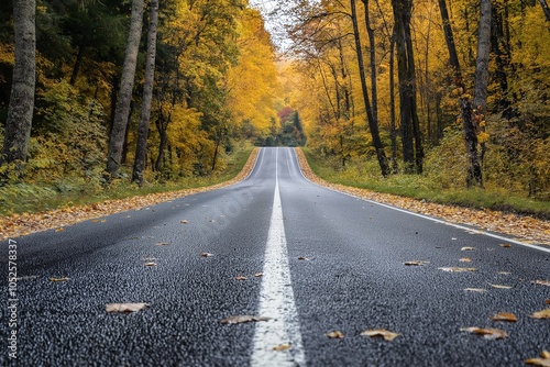 © StockUp, Obraz premium An endless road stretches through a vibrant autumn forest, with leaves scattered along its path.