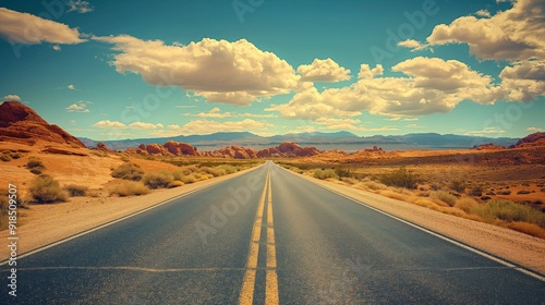 Naklejka premium An endless road stretching through a desert landscape under a vast blue sky.
