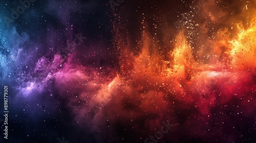 © BonzEarthsnapper, Naklejka premium An energetic abstract background showcasing a rainbow powder splash, with color explosions, dust clouds, and ink splatter effects on a black spray texture