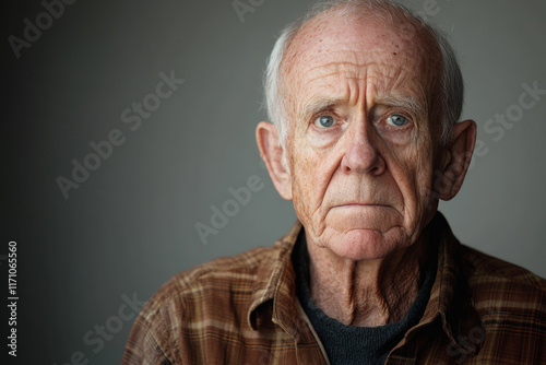 © PixelMinds, Obraz premium An engaged older man showcasing wisdom and confusion against a grey backdrop.