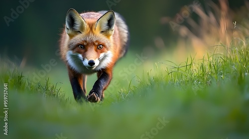 © TheseusStock, Obraz premium An engaging photograph of a red fox curiously exploring a meadow, with its vibrant fur contrasting against the green grass.