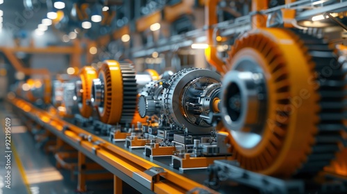 Fototapeta premium An engine assembly line in a modern factory, with multiple engines in various...