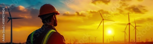 Obraz premium An engineer observes wind turbines against a vibrant sunset, symbolizing...