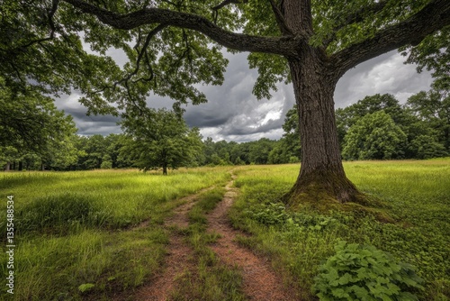 © VisualCrafter, Fototapeta premium An Enigmatic Path Winding Through a Verdant Meadow Beneath a Towering Tree