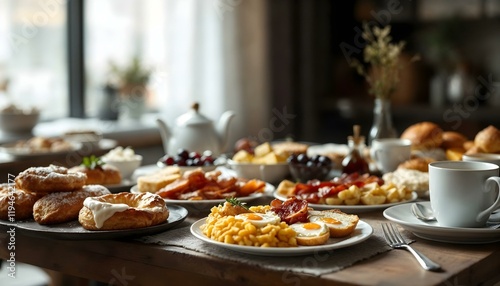 © Tahubulat, Naklejka premium An enticing breakfast buffet offering croissants, eggs, bread, fresh fruit, and hot coffee, ideal for a morning feast