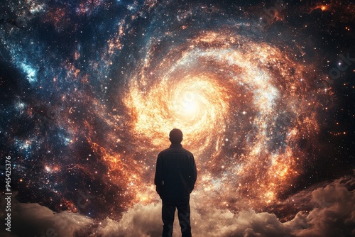© ChaoticMind, Fototapeta premium An entrancing picture showcasing a silhouetted figure gazing into a vibrant cosmic spiral, full of bright stars and deep space elements, invoking mysticism and introspection.