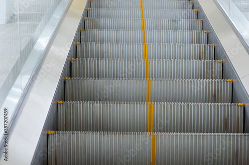© Anan, Obraz premium An escalator with a yellow line in the middle of the steps.