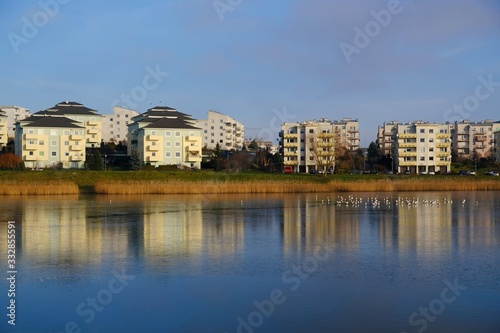 Fototapeta premium An estate of identical apartment blocks on the lake and its reflection in water, on the outskirts of the city. Idyllic view with blue sky and blue water. Gdansk South, Zakoniczyn, Poland