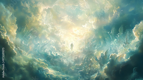 Fototapeta premium An ethereal image of God descending through clouds, radiating light and serenity