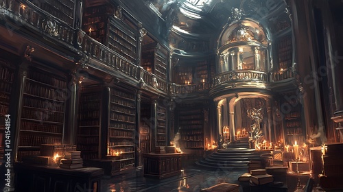 © wrap01, Fototapeta premium An Ethereal Library with Candlelight and Bookshelves