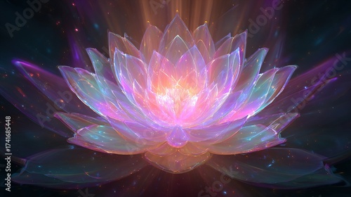 Fototapeta premium An ethereal, radiant lotus flower blossoms with layered translucent petals, glowing with soft pinks and purples