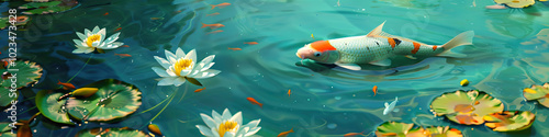 Naklejka premium An ethereal view of a Japanese koi pond with Koi fish swimming amidst water lilies in serene blue-green water.