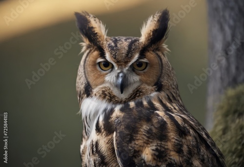 Fototapeta premium An Eurasian Eagle Owl staring at something out of shot in a woodland setting.