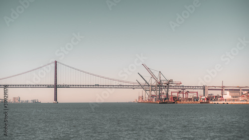 © skyNext, Fototapeta premium An evening on the Tagus river in Lisbon, Portugal: suspension bridge "Ponte 25 de Abril", recognized as the most beautiful bridge in Europe, commercial docks with cranes and cargo containers
