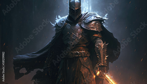 © Justlight, Fototapeta premium An evil knight cloaked in a thick dark armor brings his sword downward with a menacing roar. Fantasy art. AI generation.