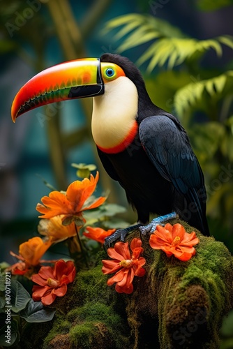 Fototapeta premium An exotic toucan perched among lush tropical foliage against vibrant jungle...