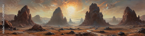 Fototapeta premium An expansive alien landscape with massive, pulsating energy fields and strange, levitating rocks, captured in thick oil paint to emphasize the dynamic and otherworldly atmosphere, Generative AI
