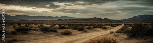Fototapeta premium An expansive desert with a dramatic sky. Horizontal banner. AI generated