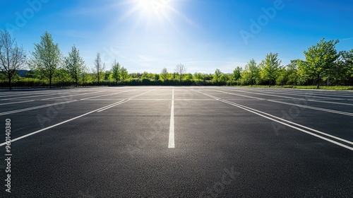 Fototapeta premium An expansive empty parking lot with smooth asphalt and clear white lines, under a bright midday sun, providing a clean and open look