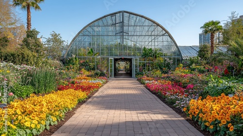 © kamonrat, Naklejka premium An expansive greenhouse brimming with plants, framed by tall buildings in the distance, showcasing the intersection of nature and city life