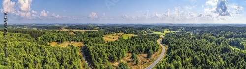 © melvilsky, Naklejka premium An expansive panoramic view showcases a lush green forest and winding road beneath a bright blue sky.