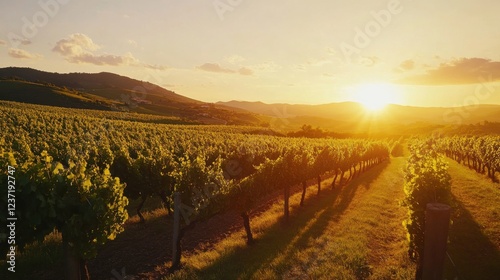 © LorelEino, Fototapeta premium An expansive vineyard at sunset with grapevines stretching across rolling hills, Vineyard scene, Natural beauty style