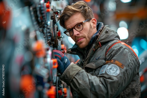 Fototapeta premium An expert technician meticulously works on sophisticated machinery, focus on...