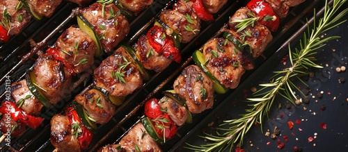 Fototapeta premium An expertly prepared grill featuring delicious skewered meat and vegetables...