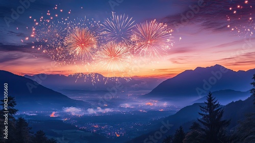 Fototapeta premium An explosion of fireworks over a serene mountain landscape, creating a...
