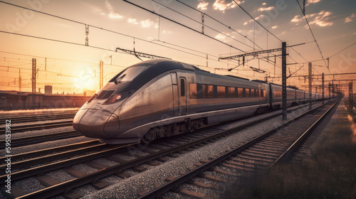 Naklejka premium an express train runs in the sunset. transportation concept. Generative AI