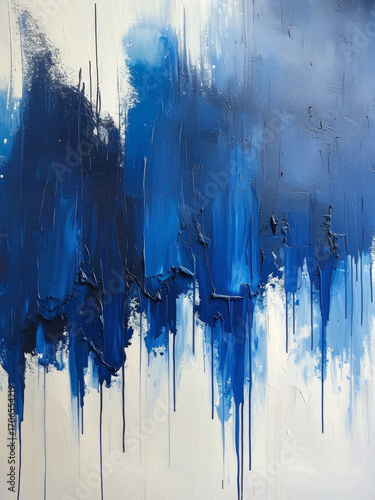 © rasolmar, Obraz premium An expressive abstract painting with heavy impasto textures and dramatic drips of deep blue paint against a white background. The artwork conveys raw emotion and movement.