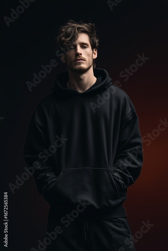 Fototapeta premium An expressive portrait of a handsome young man in a minimalist black hoodie, capturing a blend of casual style and quiet contemplation, against a dramatic dark backdrop