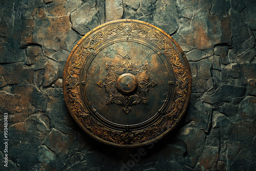 Naklejka premium An exquisite bronze shield adorned with intricate designs, embodying craftsmanship and historical significance.