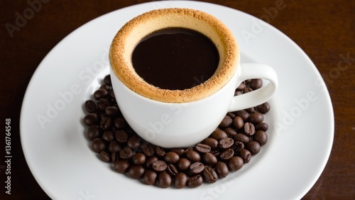 © Kasivat, Fototapeta premium An Exquisite Coffee Creation: Dark Roast Infusion in a Cookie Cup Resting on Freshly Roasted Coffee Beans.
