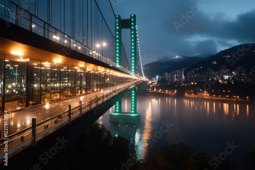 Naklejka premium An exquisite view where a well-lit bridge stretches over reflective waters,...