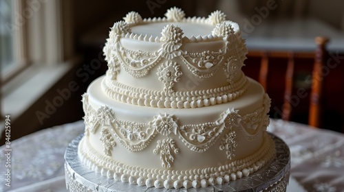 © aicandy, Fototapeta premium An exquisitely decorated two-tiered wedding cake with intricate vanilla frosting designs set on a table covered with a delicate lace cloth near a window